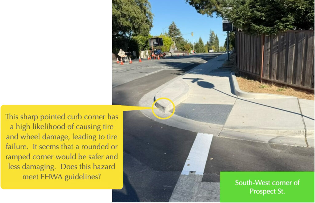 This sharp pointed curb shown below is a serious hazard and will cause wheel and tire failures. It should be changed to allow a ramped or otherwise shape to remove the tire damage risk. This is a corridor wide problem with recent DPW corner curbs as this issue occurs at several locations, including at Avy and Palo Alto Way.