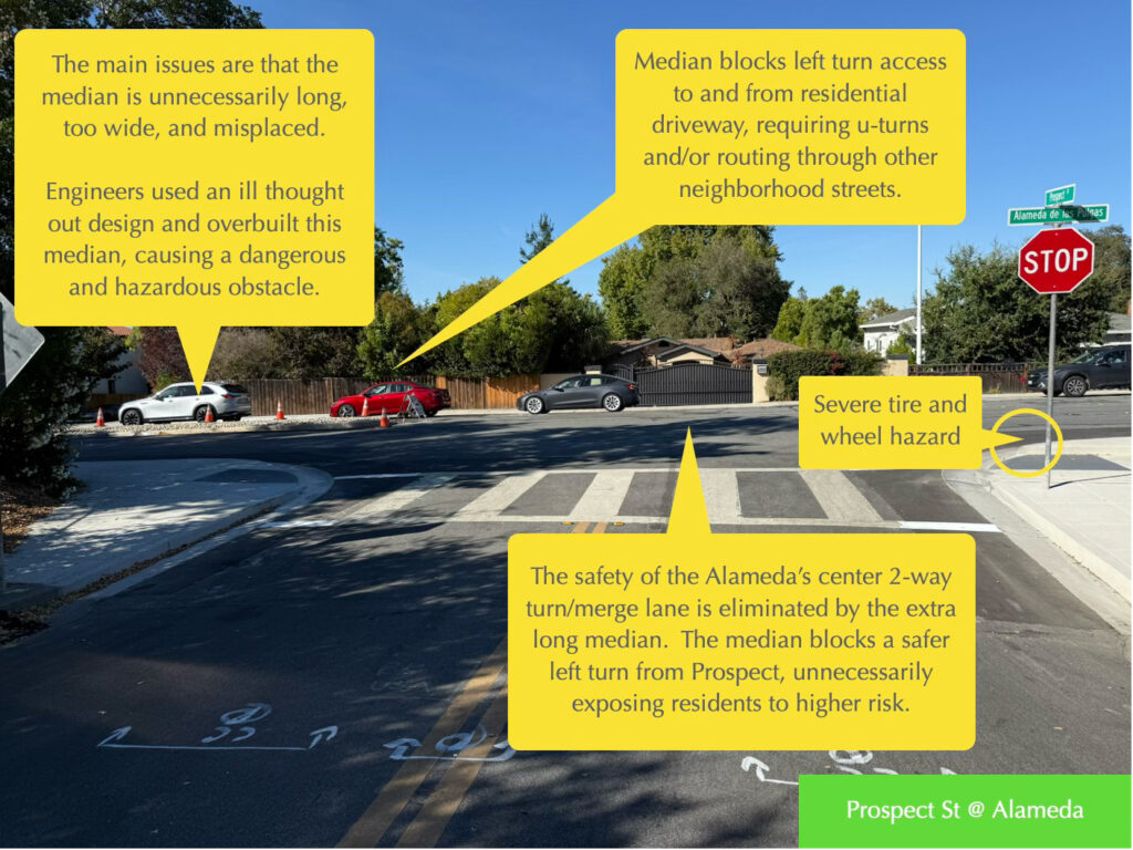 • Prospect residents are blocked from making safer and easier left turns to enter Alameda traffic.