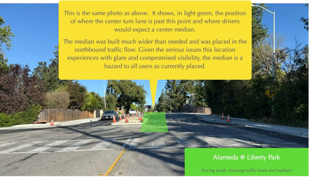 • Road way consistency and motorist awareness — The plan implements a design that fails to incorporate the geography of the road, Alameda at this location is on a crest of the hill, the sunlight blinding glare, and the other lighting issues of brightness and shadows. Raised medians in the traffic path, lane shifts, longer crosswalk all on a ‘blind crest’ of the hill creates a high risk to all users. Motorists have just seconds of visibility before they have to react. These NB motorists must abruptly react and veer towards the bike lane and sidewalk to avoid hitting the raised median, put cyclists and pedestrians at great risk.