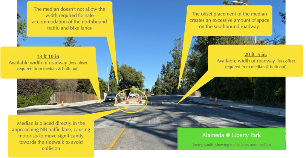 The implementation of changes on Alameda between Prospect St. and Liberty Park Ave has unfortunately created a situation where our safety goals are not being met; or, stated differently, that our safety goals were compromised in favor of an ill thought out median and its placement.